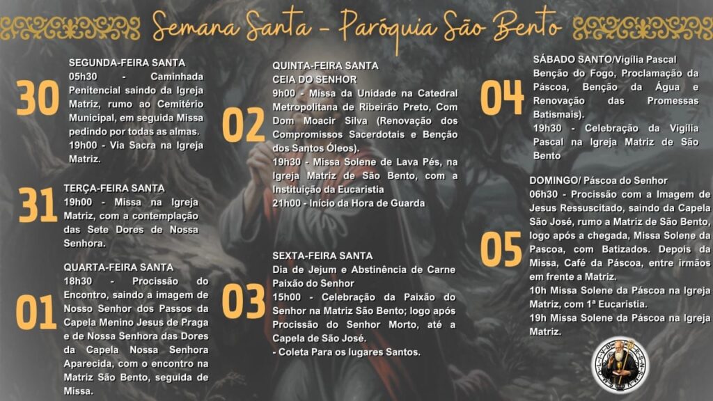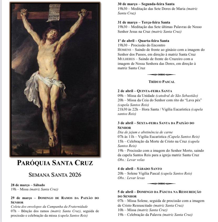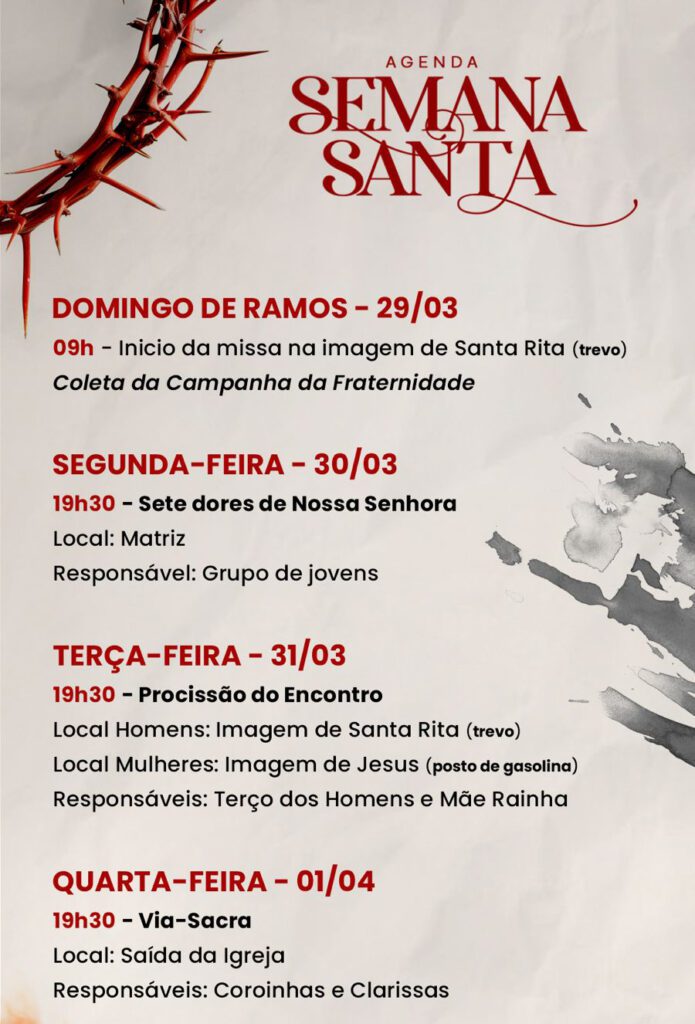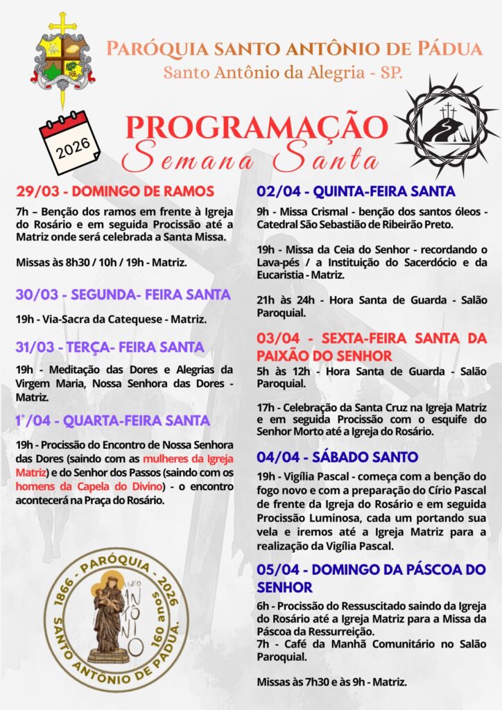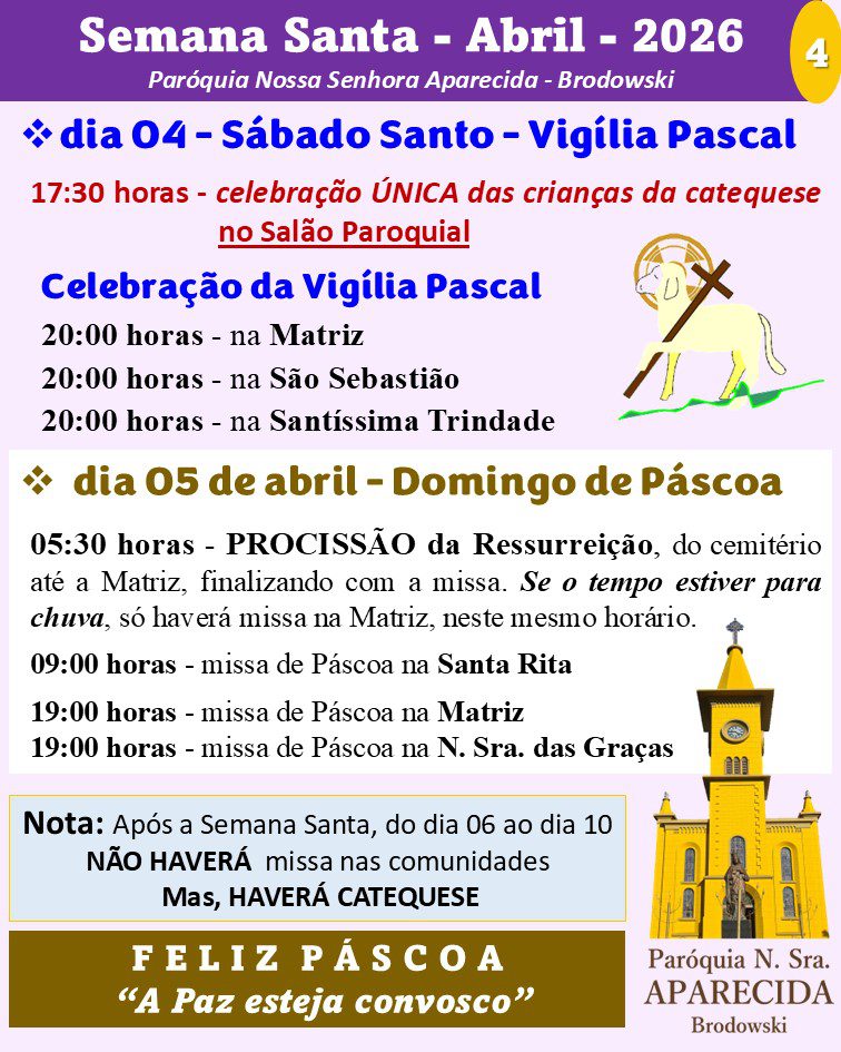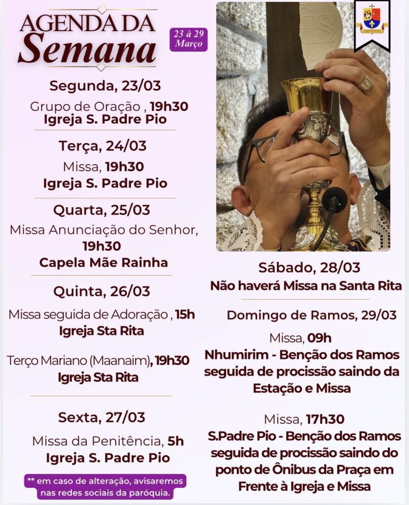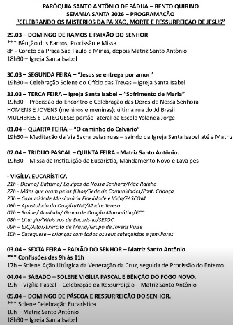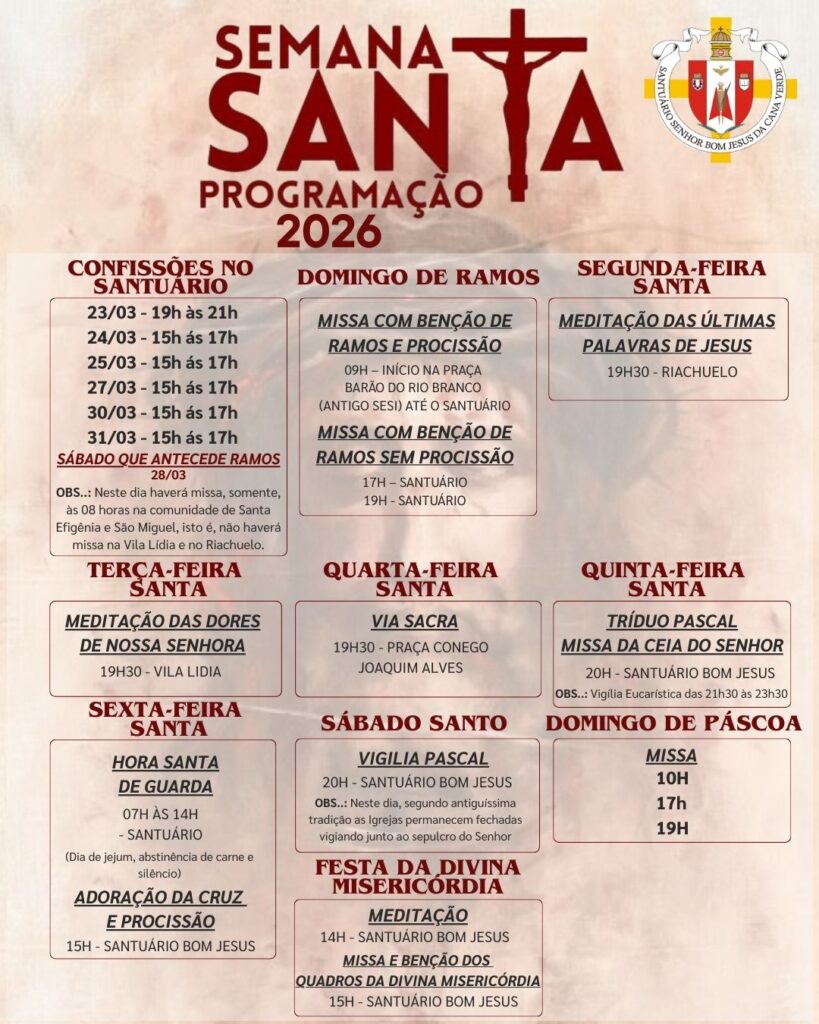 Obs.: terminada esta celebração, nos reuniremos com todos os coroinhas, acólitos e clarissas no Salão São João Paulo ll, para o costumeiro “momento pascal” junto a este querido e especial grupo.