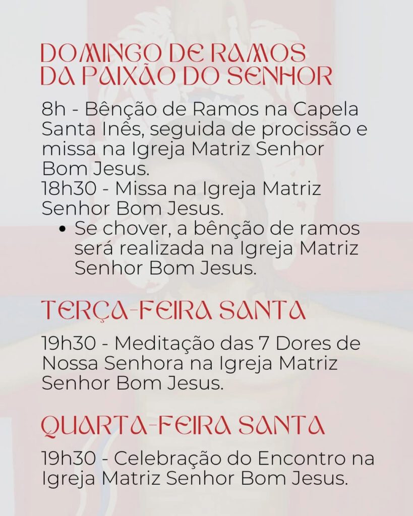 • Não se celebrará Missa às 10h, porque um pouco mais longa será a “Missa das Oito” que contará com a bênção dos ramos e procissão.