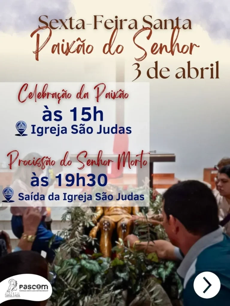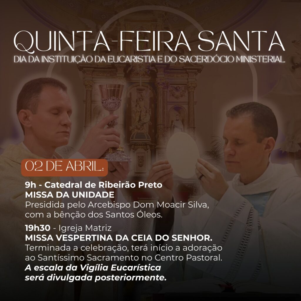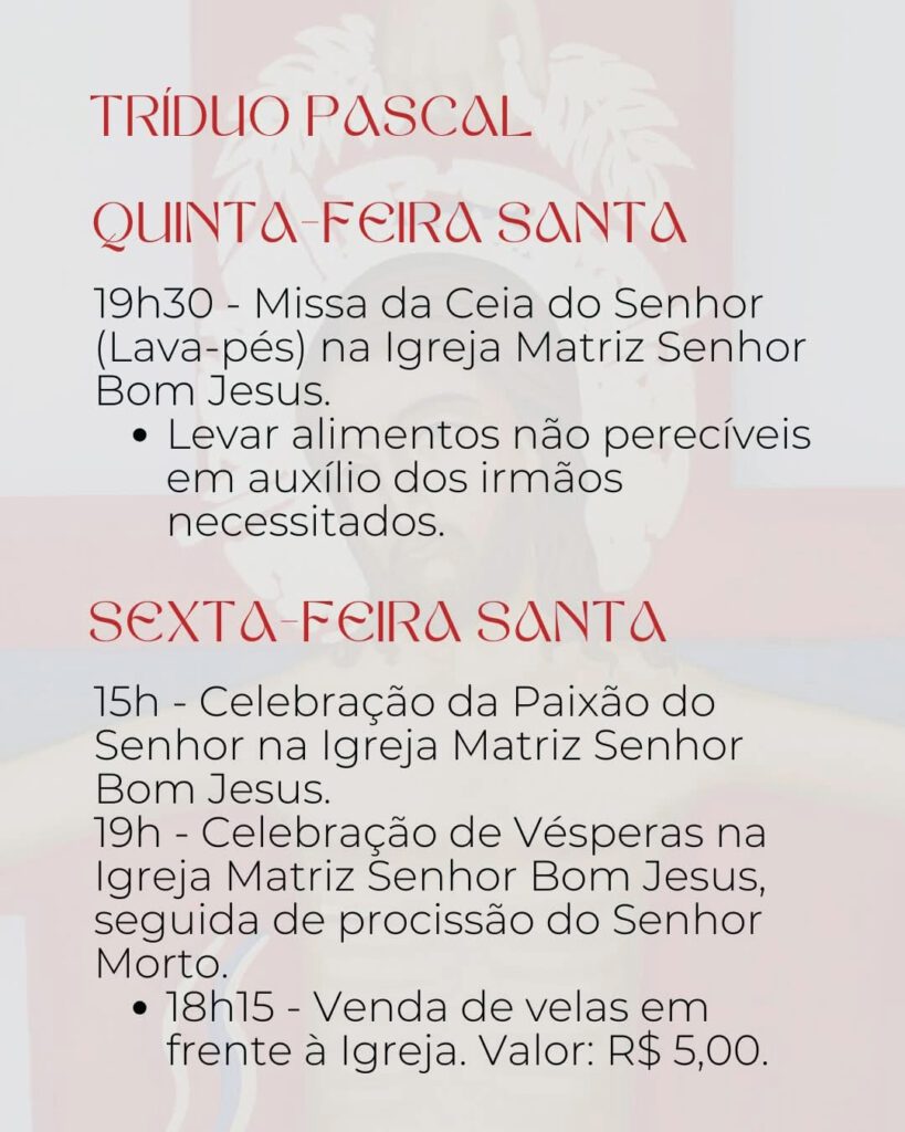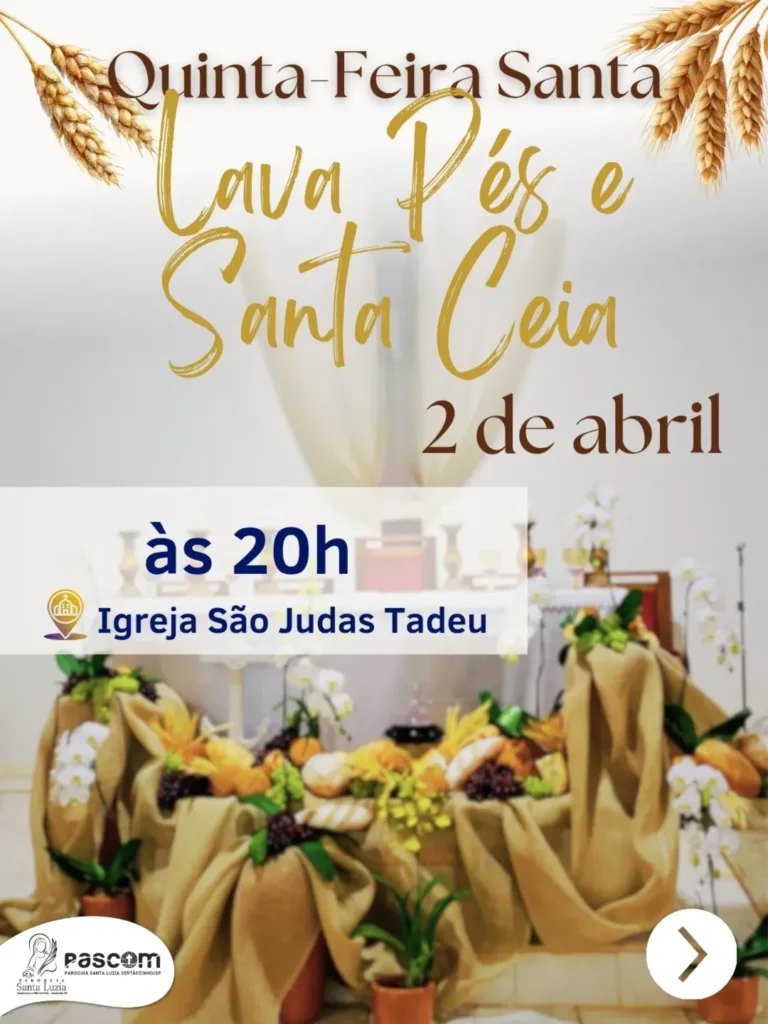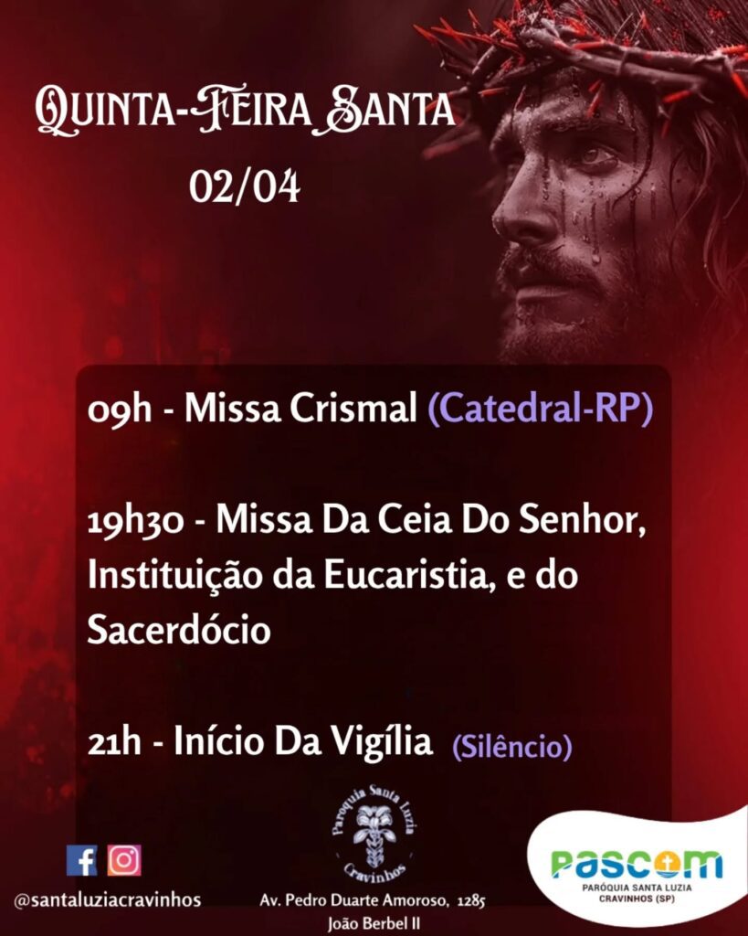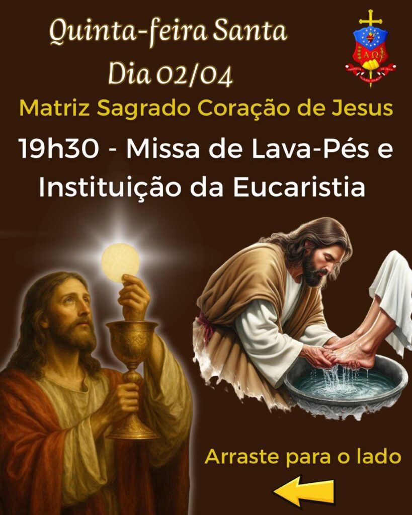 Atenção: após a celebração, o santíssimo sacramento será transladado até o altar monumento, onde permanecerá recebendo a adoração de todo o corpo paroquial, bem como de todo nosso povo até às 14h30 de Sexta-feira Santa