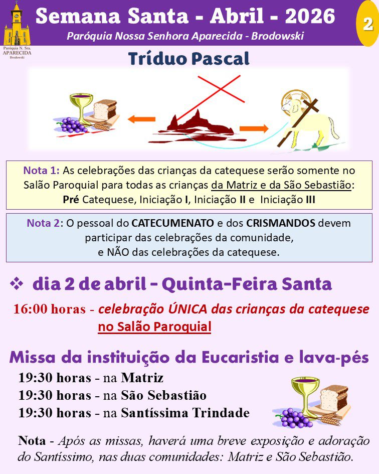 Atenção: como gesto concreto pascal, pedimos que, os catequizandos tragam feijão e as catequizandas tragam macarrão, para compormos as cestas básicas para as famílias assistidas pela paróquia.