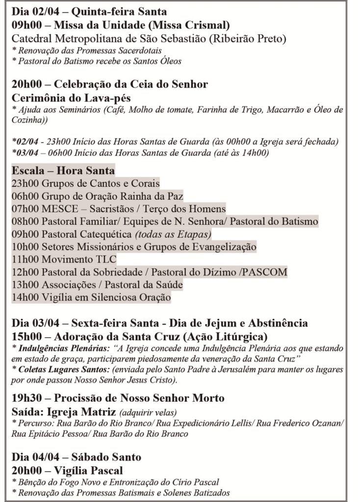 Caso a programação da sua paróquia não esteja na relação, favor enviá-la para o e-mail: contato@arquidioceserp.org.br