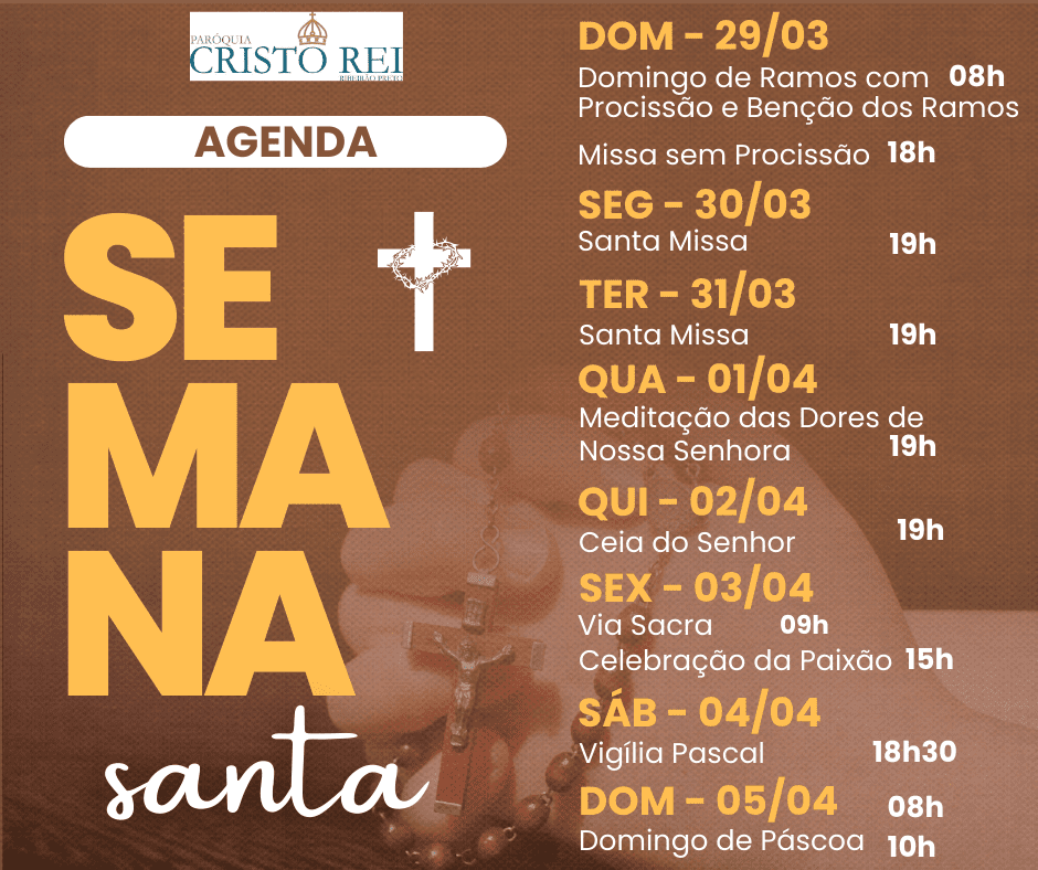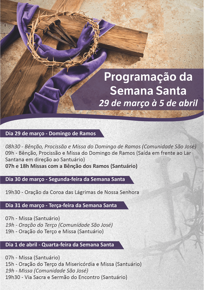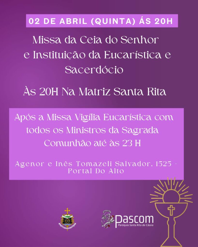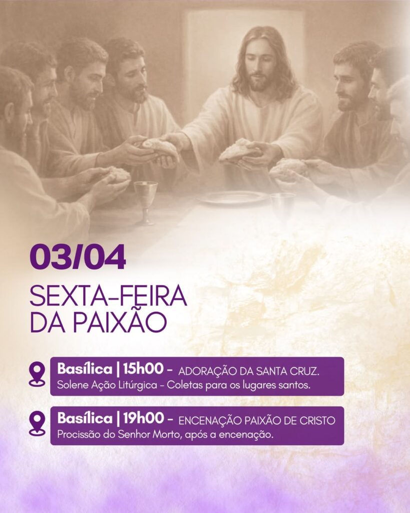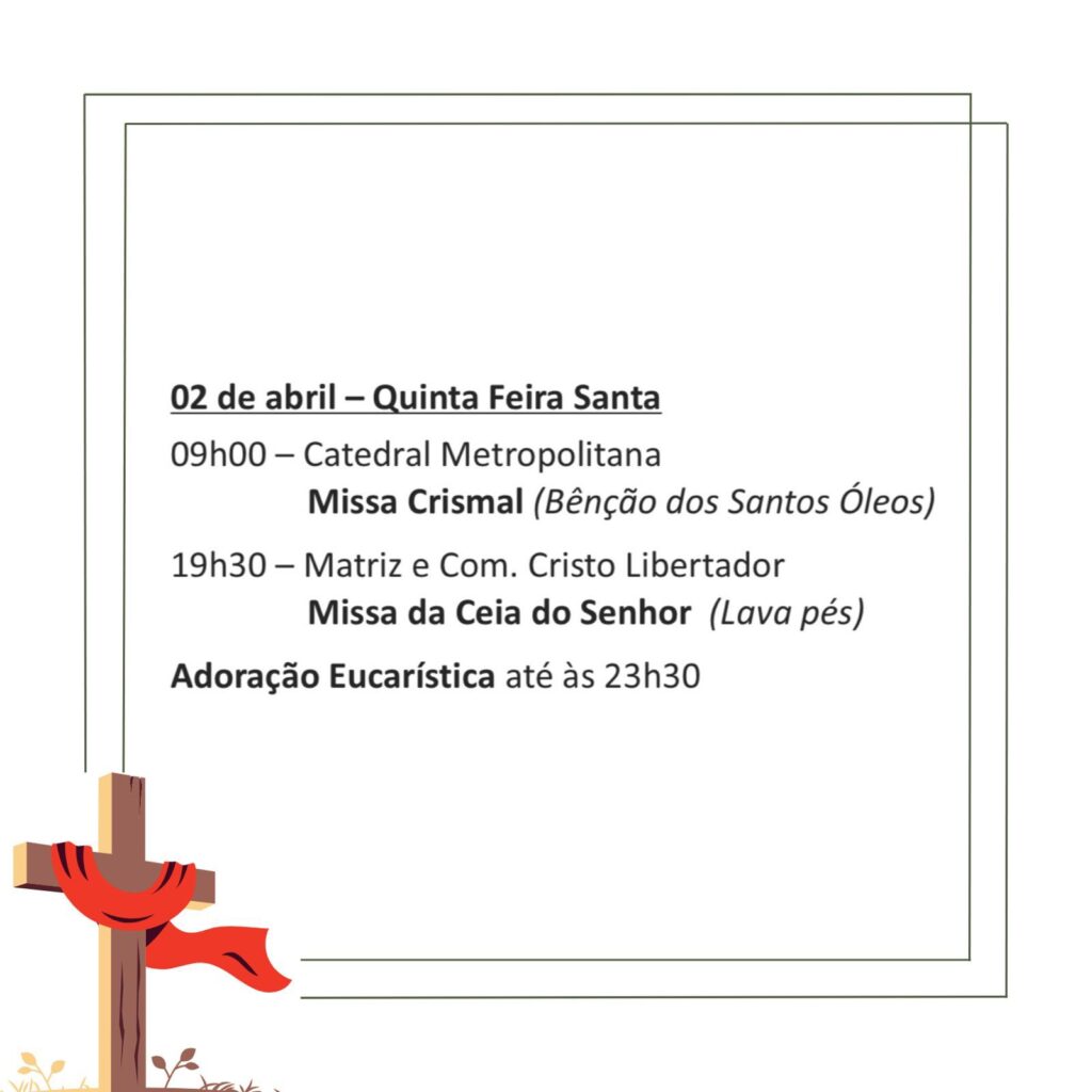 19h30: Missa da ceia do Senhor e em seguida adoração até às 22h. Retomada a partir das 7h30 da Sexta-feira (03/04).
