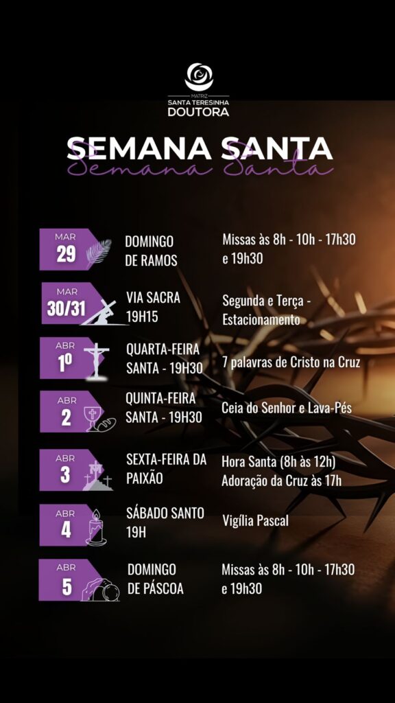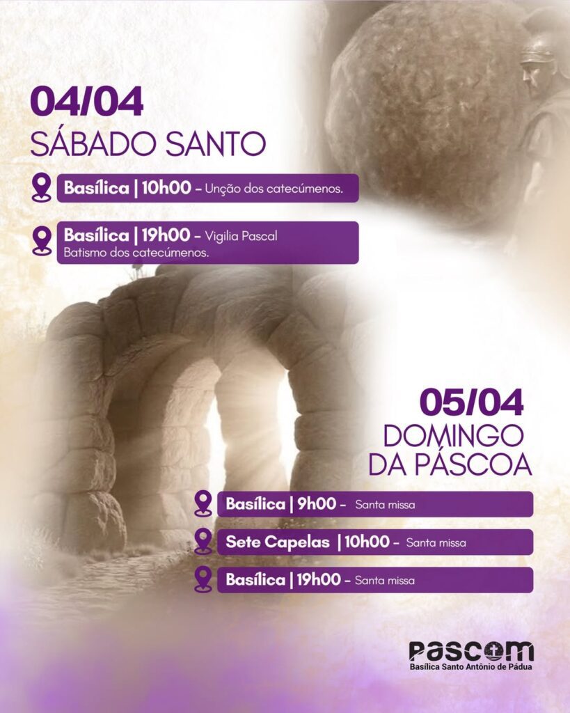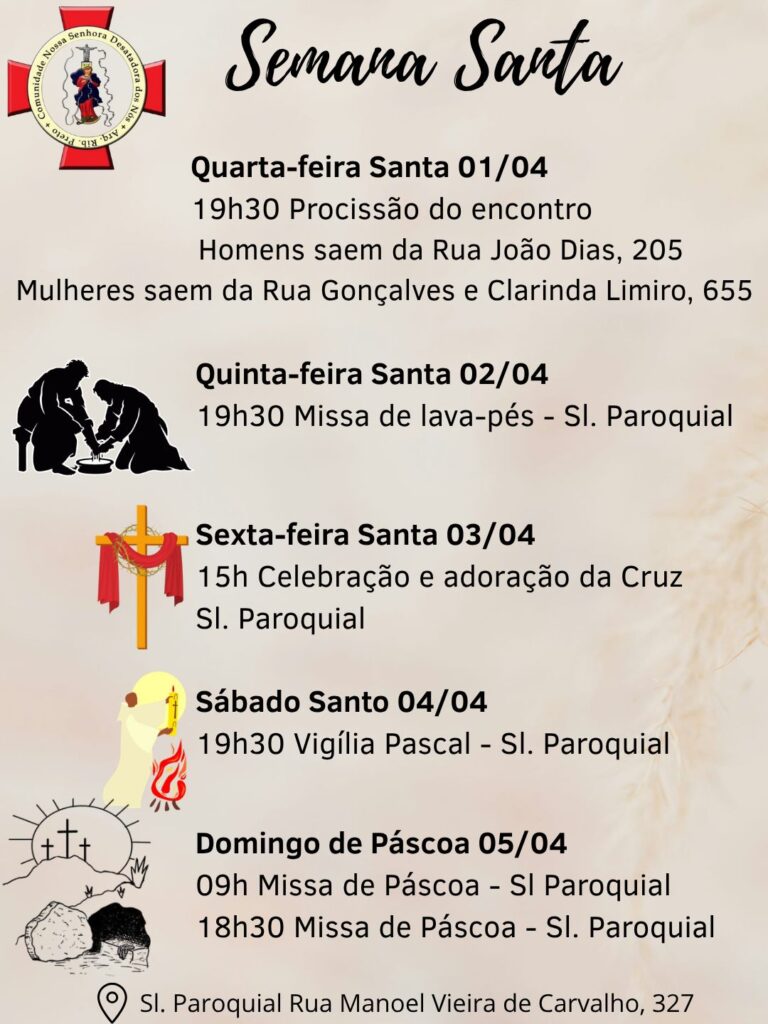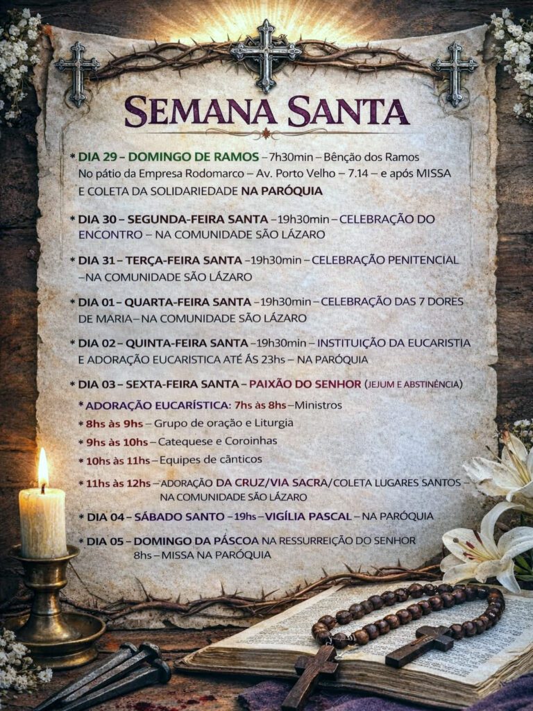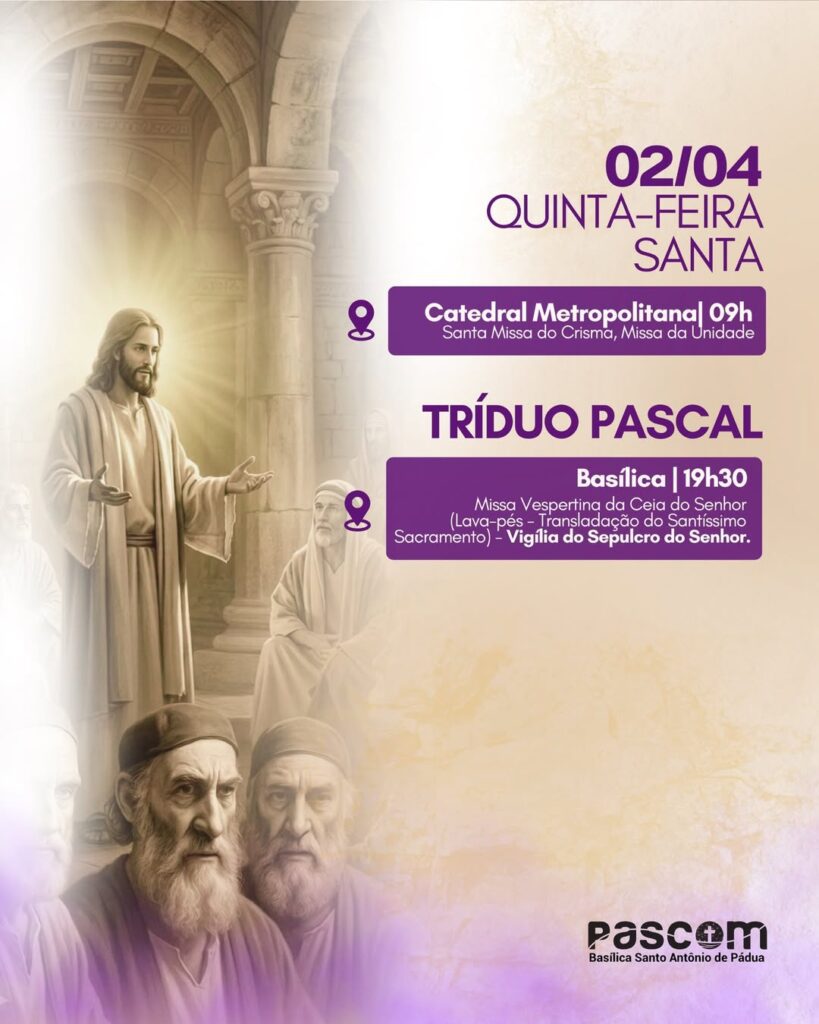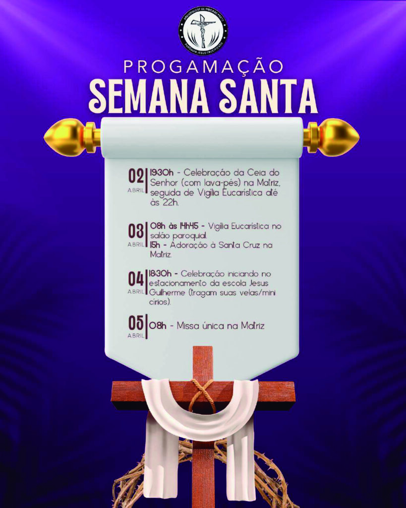 19h30: Missa da ceia do Senhor e em seguida adoração até às 22h. Retomada a partir das 7h30 da Sexta-feira (03/04).