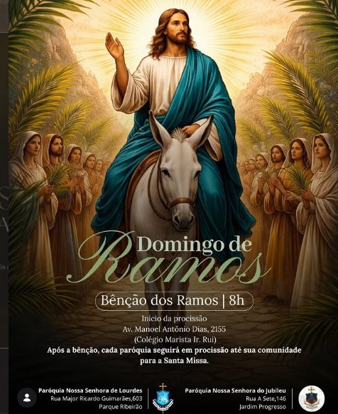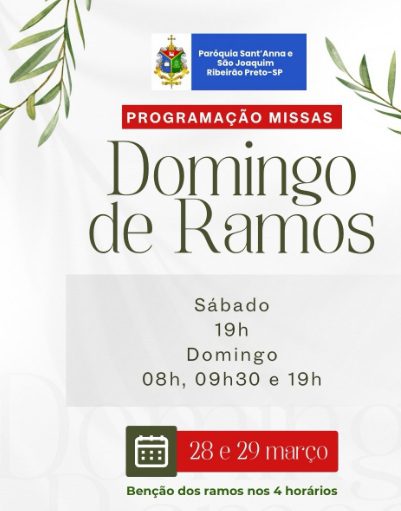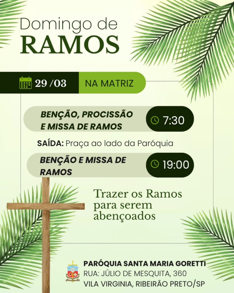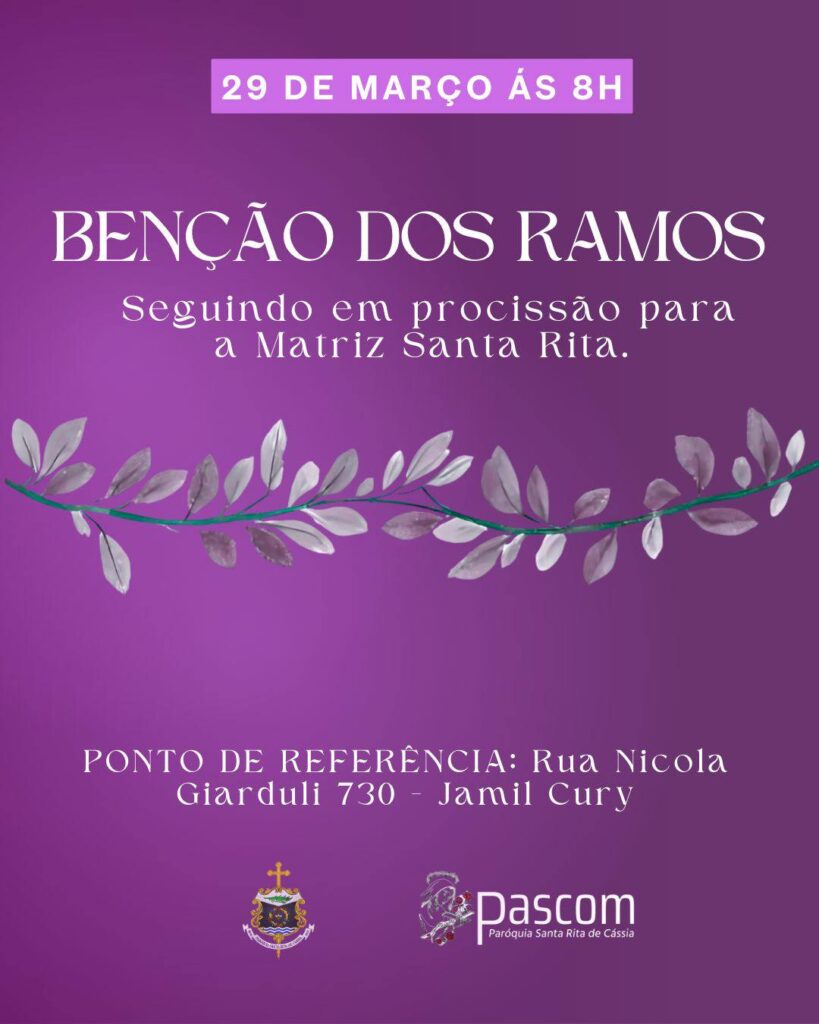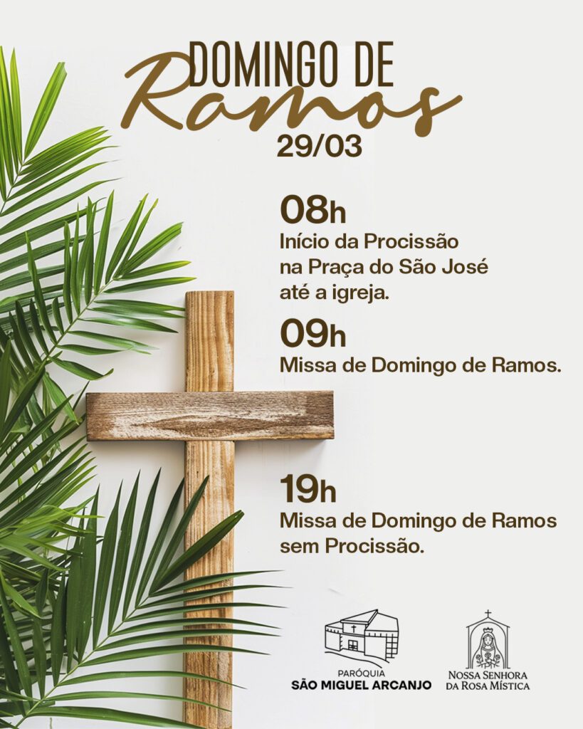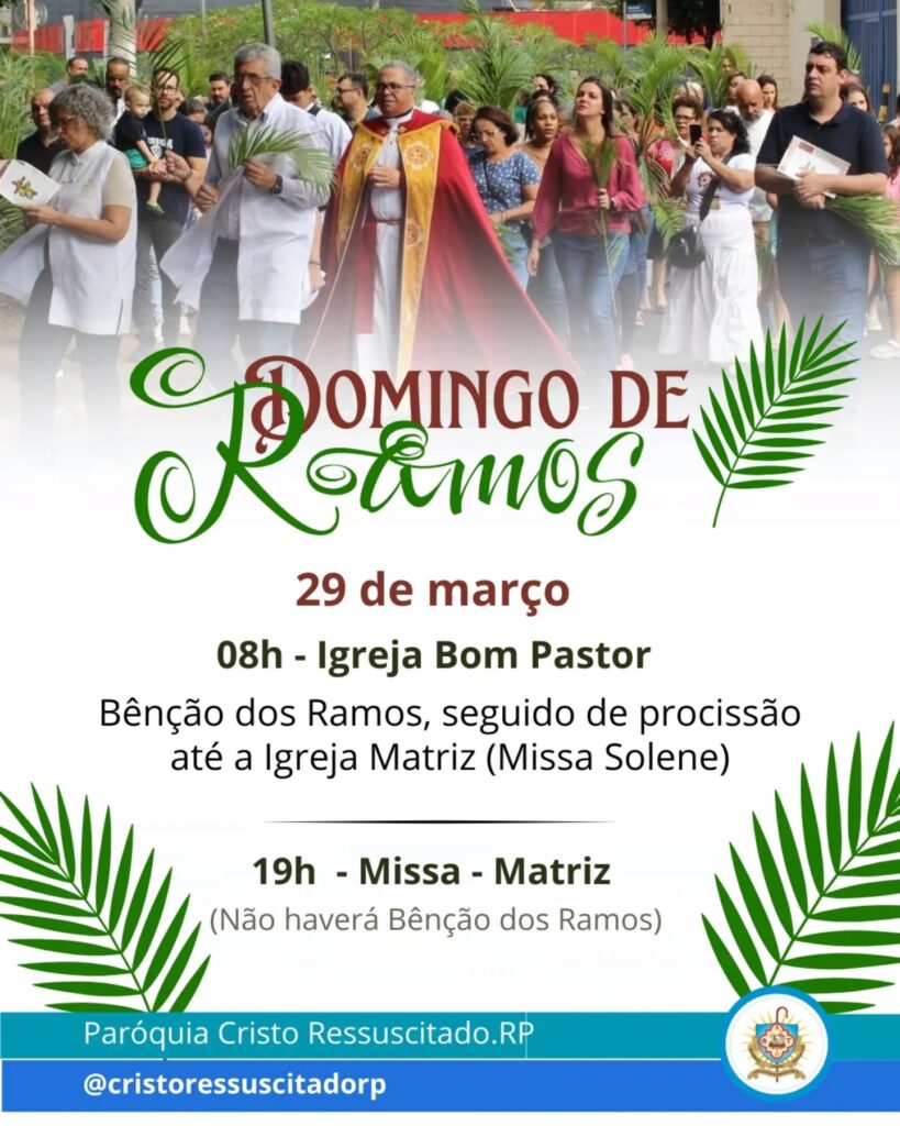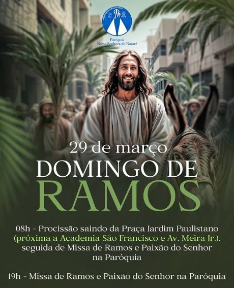 08h30: Concentração na Praça 7 de Setembro, às 9hs benção dos Ramos e Procissão até a Paróquia pela rua Florêncio de Abreu. Não haverá missa das 8h.