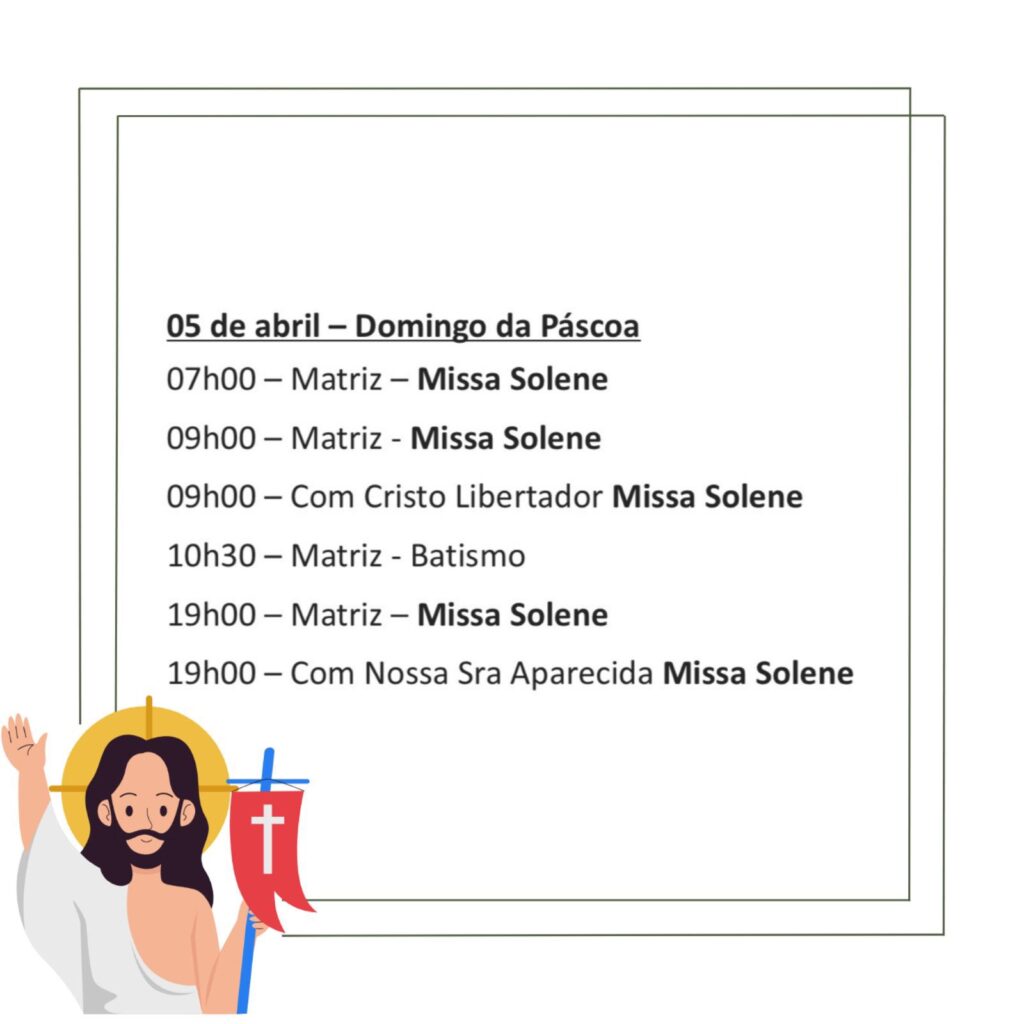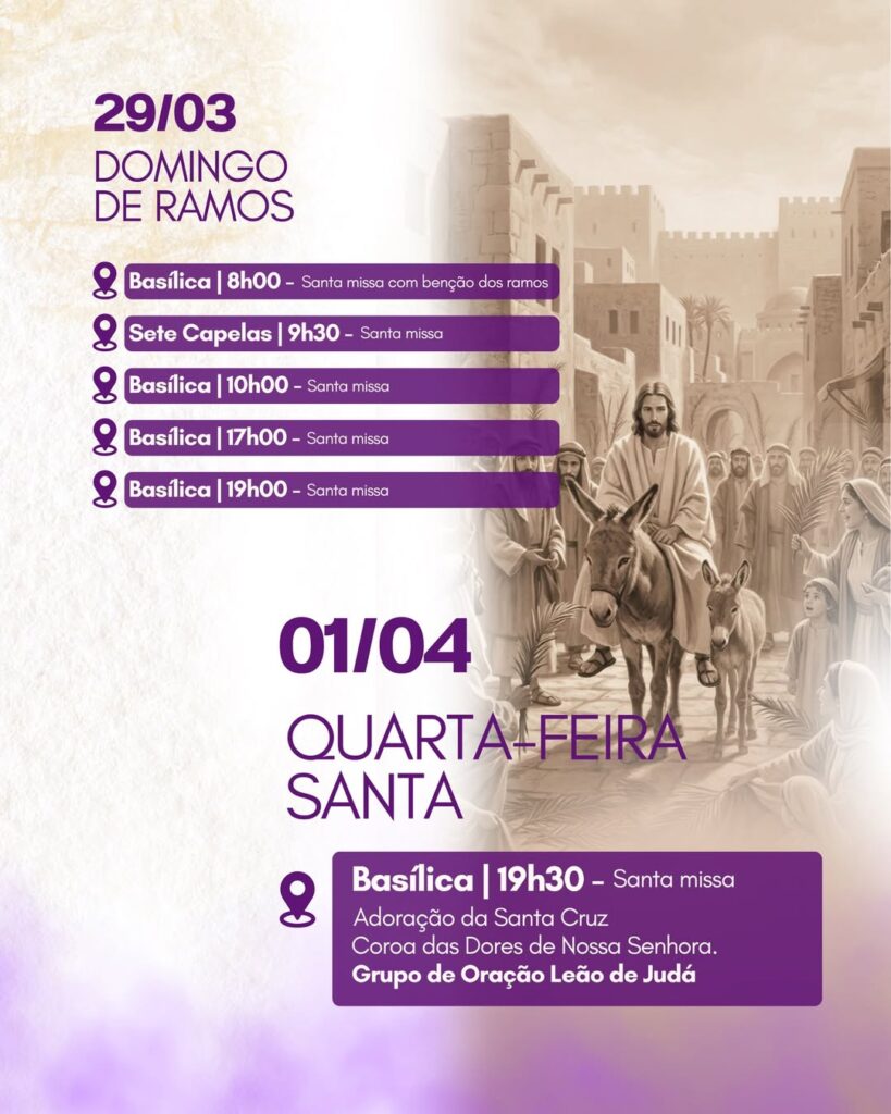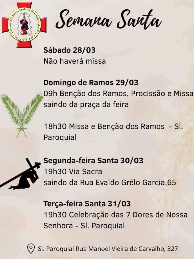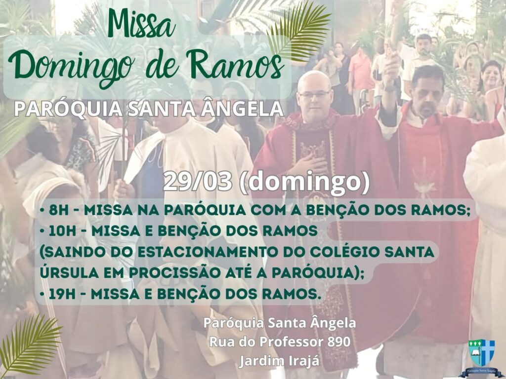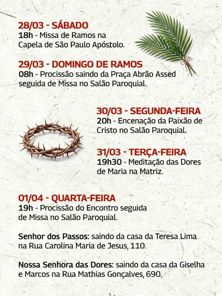 08h30: Concentração na Praça 7 de Setembro, às 9hs benção dos Ramos e Procissão até a Paróquia pela rua Florêncio de Abreu. Não haverá missa das 8h.
