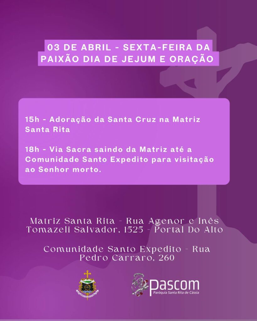 15h – Celebração da Paixão e Morte do Senhor. Seguido de procissão: Meditação das 7 Dores de Maria e Santo Enterro.