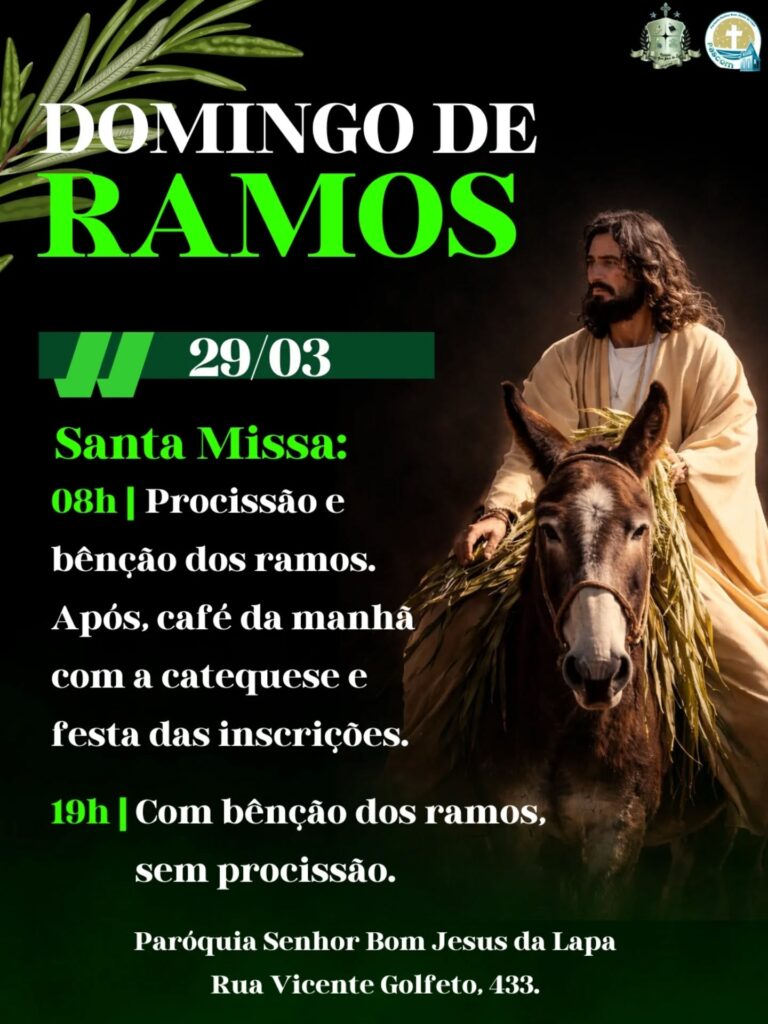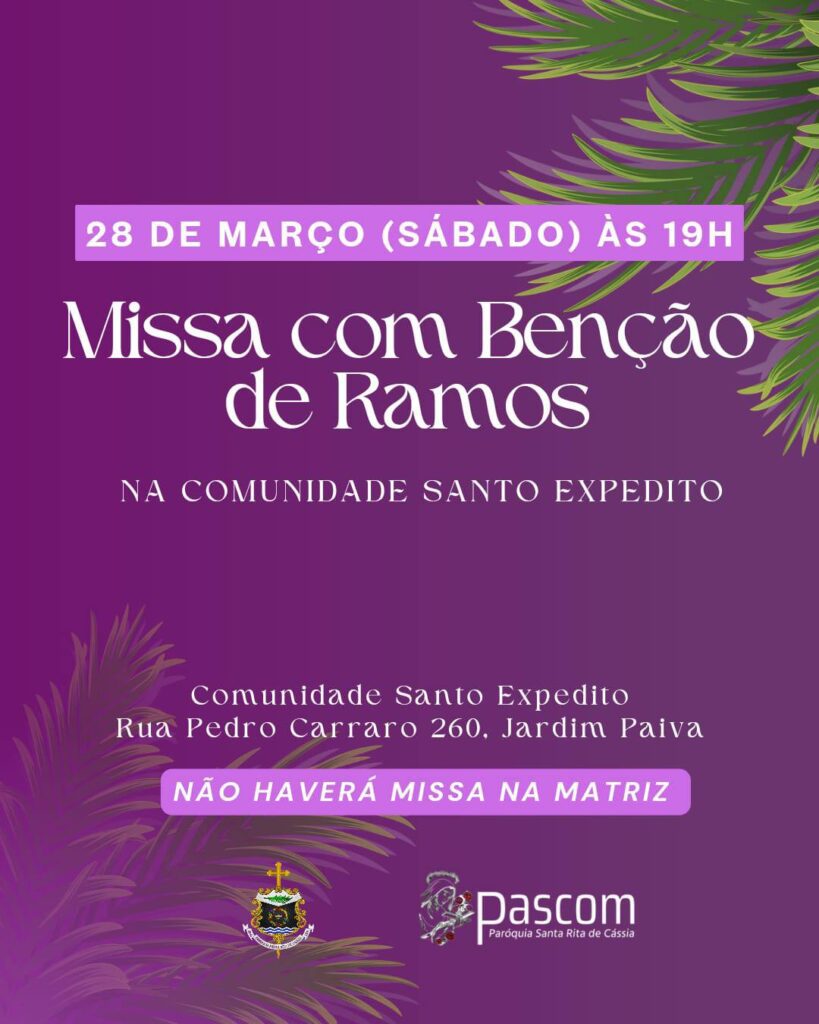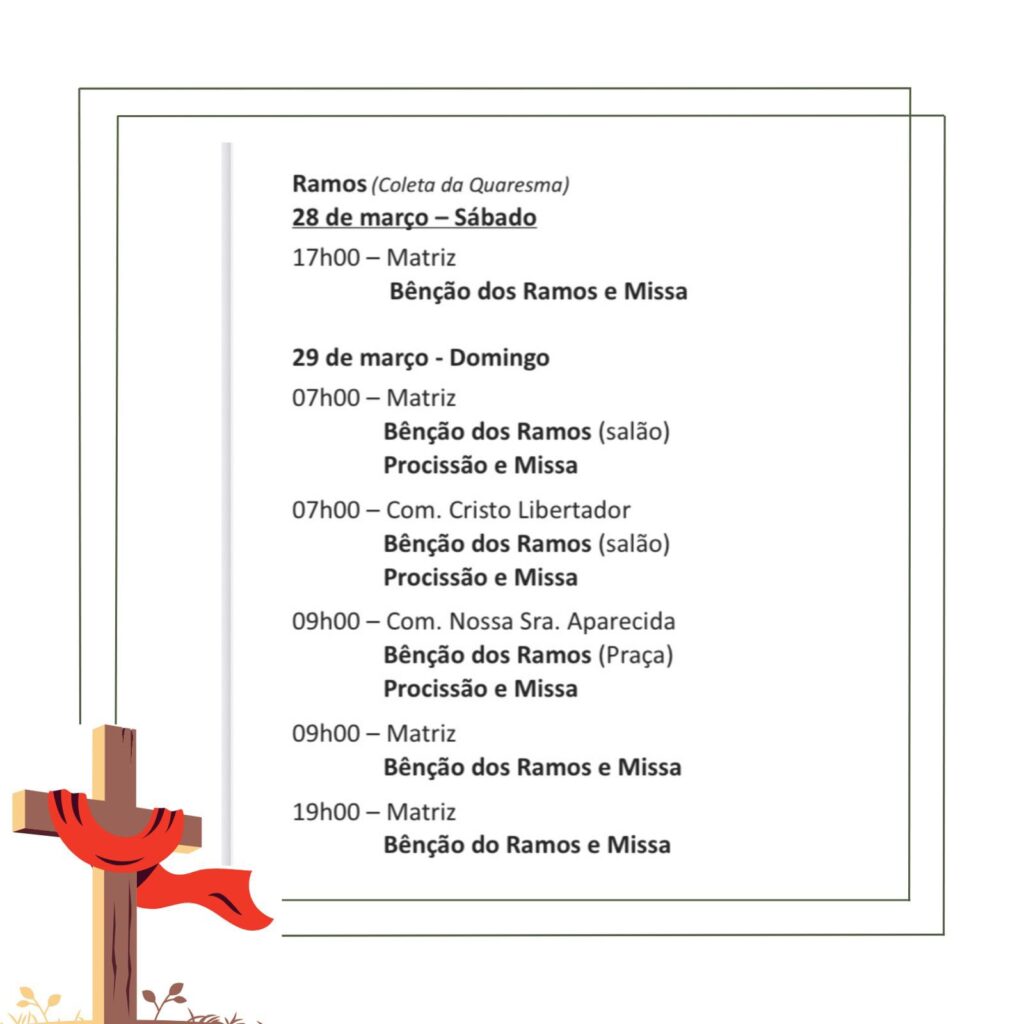 08h30: Concentração na Praça 7 de Setembro, às 9hs benção dos Ramos e Procissão até a Paróquia pela rua Florêncio de Abreu. Não haverá missa das 8h.