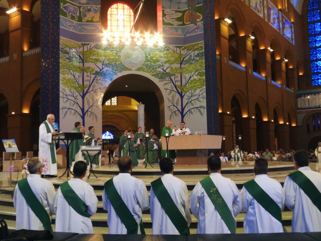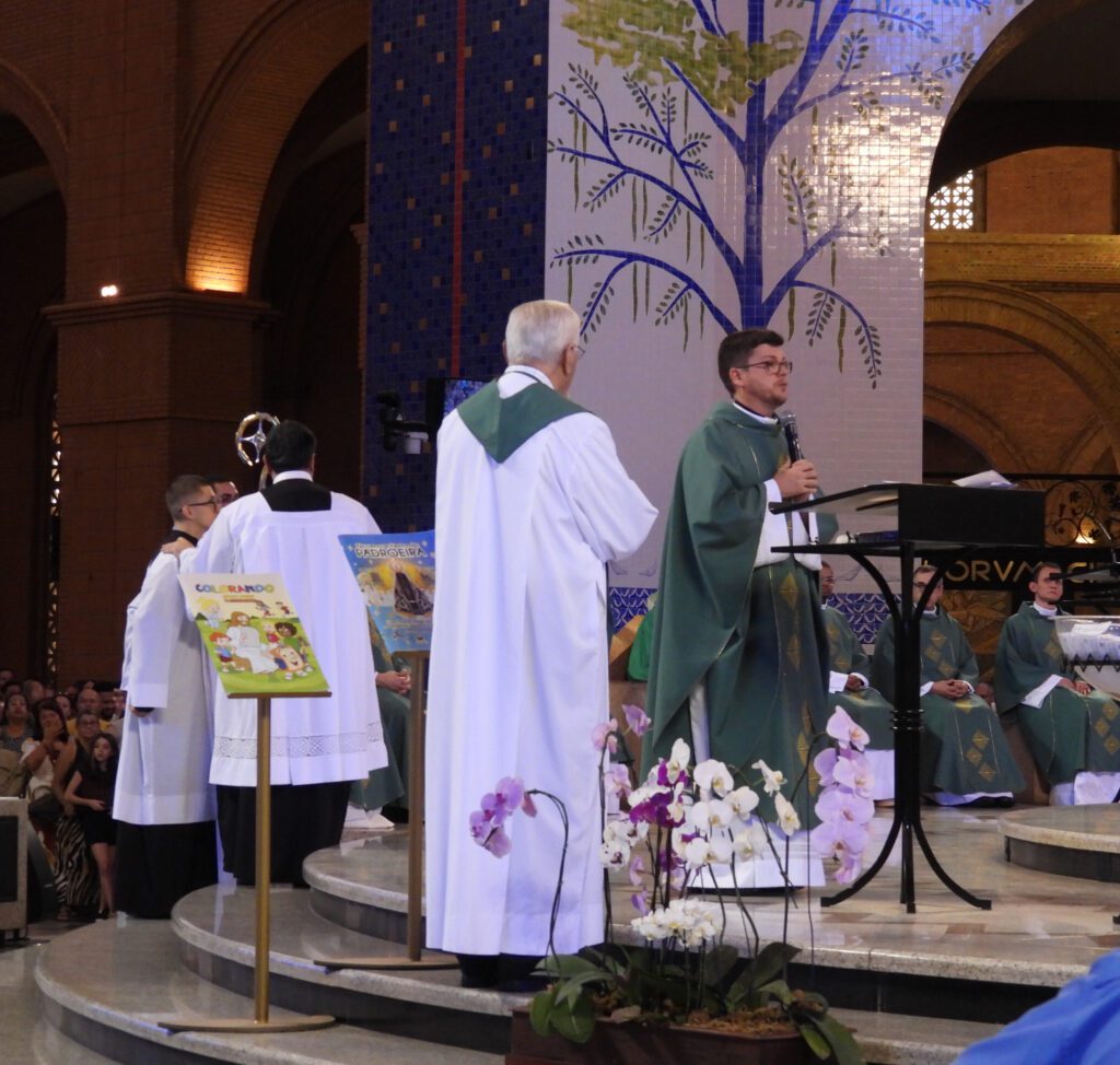 Antes dos ritos finais, o padre Luís Gustavo Tenan Benzi, coordenador arquidiocesano de pastoral, fez os agradecimentos: “A primeira palavra é de gratidão a Deus pela realização desta nona Romaria Arquidiocesana ao Santuário de Aparecida. Nossa gratidão ao Santuário pela esplêndida acolhida que faz com cada um dos nossos fiéis. Também queremos colocar, nesta bênção final, no coração de Deus, pelas mãos de Maria, a Mãe Aparecida, os mais de 3 mil fiéis da nossa Arquidiocese de Ribeirão Preto, que estão aqui celebrando conosco ao redor deste altar. Colocar o nosso presbitério, os padres, especialmente aqueles que estão enfermos, fora da diocese por estudos ou missão, colocar também os diáconos, as famílias, todos aqueles que estão se dedicando para a construção de uma igreja mais sinodal. Pedimos que Deus abençoe de forma bastante particular os nossos seminaristas, aqueles que aqui estão, também aqueles que estão em missão em Manaus, juntamente com o reitor do Seminário Propedêutico, os vocacionados que estão fazendo o caminho vocacional e também um incontável número de fiéis leigos e leigas que todos os dias no trabalho de suas comunidades se empenham para que a Arquidiocese de Ribeirão Preto seja cada vez mais o resplendor do Cristo ressuscitado onde nós nos fazemos presentes. Que esta bênção de nosso arcebispo Dom Moacir chegue ao coração de todos aqueles que de suas casas em nossa Arquidiocese acompanham e celebram conosco também este momento de fé e devoção”, finalizou o coordenador de pastoral.