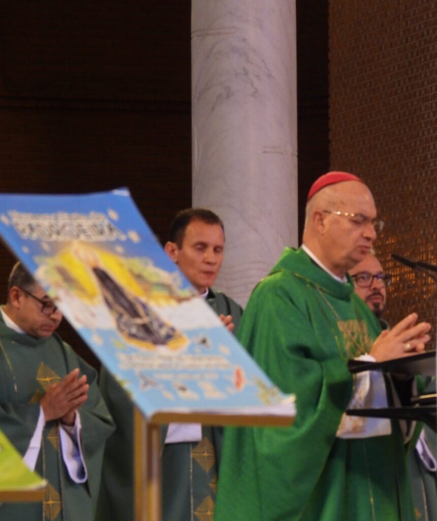 O arcebispo dom Moacir Silva, na introdução da homilia, saudou os romeiros e romeiras participantes da 9ª Romaria Arquidiocesana e reforçou a importância de trazermos a sinodalidade na temática da romaria. “Queridos irmãos e queridas irmãs no santo Batismo. Queridos irmãos e queridas irmãs na vida consagrada. Queridos irmãos no ministério ordenado! Queridos e queridas irmãs que rezam conosco pela TV, rádio, internet e mídias sociais. Queridos fiéis da Arquidiocese de Ribeirão Preto. Estamos na 9ª Romaria Arquidiocesana na casa da Mãe Aparecida. ‘Com Maria Mãe da esperança, construir uma Igreja Sinodal’; conscientes de que ‘o caminho sinodal é precisamente o caminho que Deus espera da Igreja do terceiro milênio’ (Papa Francisco, discurso na comemoração dos 50 anos da instituição do Sínodo dos Bispos – 17/10/15. A Sinodalidade implica a escuta da Palavra de Deus; e a liturgia deste Domingo nos convida a uma reflexão sobre o lugar que o dinheiro e os outros bens materiais devem assumir na nossa vida. De acordo com a Palavra de Deus que acabamos de ouvir os discípulos de Jesus devem evitar que a ganância ou o desejo imoderado do lucro manipulem as suas vidas e condicionem as suas opções; em contrapartida, são convidados a procurar os valores do ‘Reino’, destacou o arcebispo.
