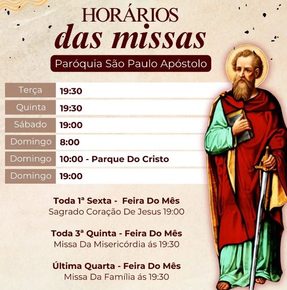 Domingo: 8h e 19h (Matriz) / 10h (Parque do Cristo)