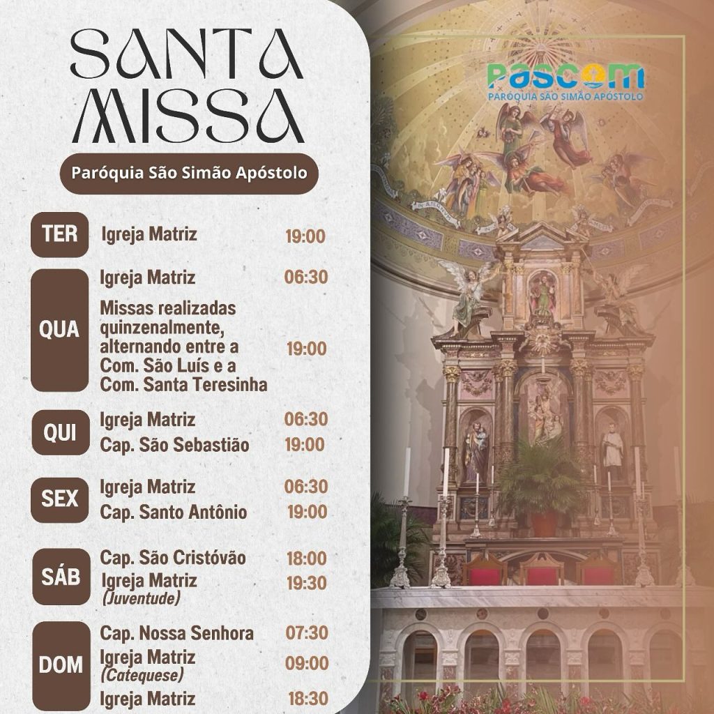 Os horários de missas durante a semana são intercalados nas Comunidades São Luís Gonzaga e Santa Teresinha do Menino, nas quartas-feiras, às 19h.