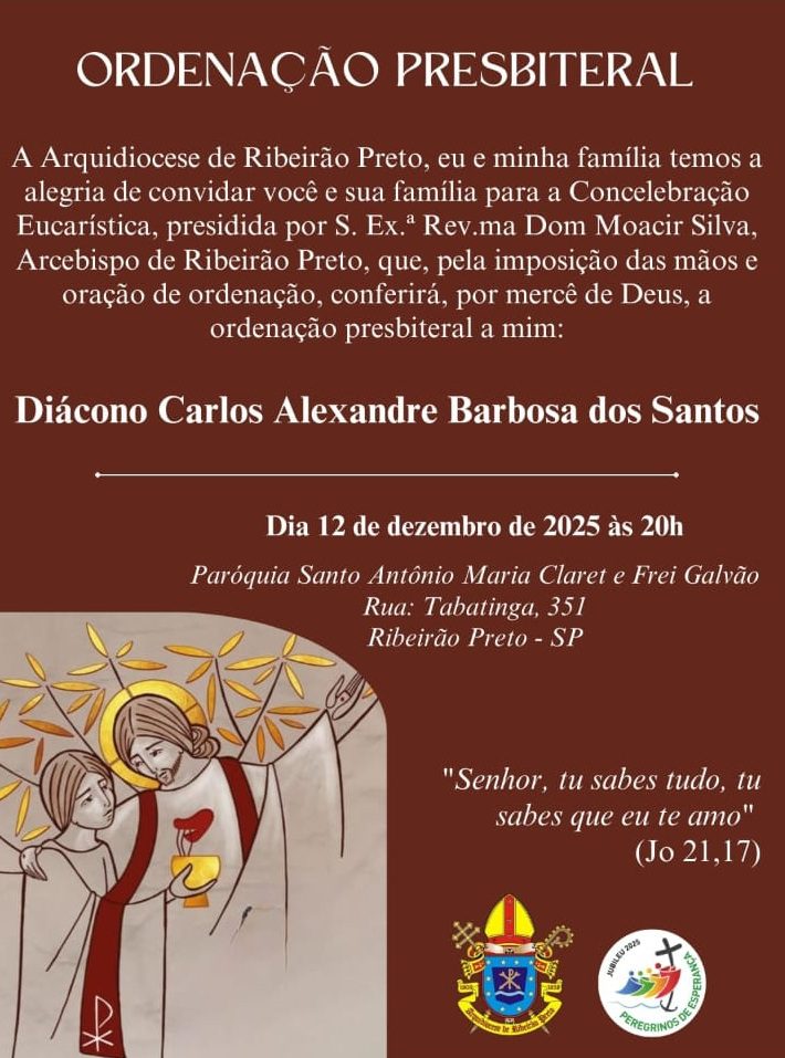 Para fortalecer a cultura vocacional, o Serviço de Animação Vocacional da Arquidiocese de Ribeirão Preto, encaminha as comunidades paroquiais duas preces a serem rezadas nas missas dos finais de semana seguintes as ordenações presbiterais. As ordenações presbiterais acontecerão nos meses de novembro e dezembro nas cidades de Altinópolis, Brodowski e Ribeirão Preto. Serão ordenados, os diáconos transitórios: Carlos Alexandre Barbosa dos Santos, Leandro Júnior Leite e Luís Fernando de Oliveira.