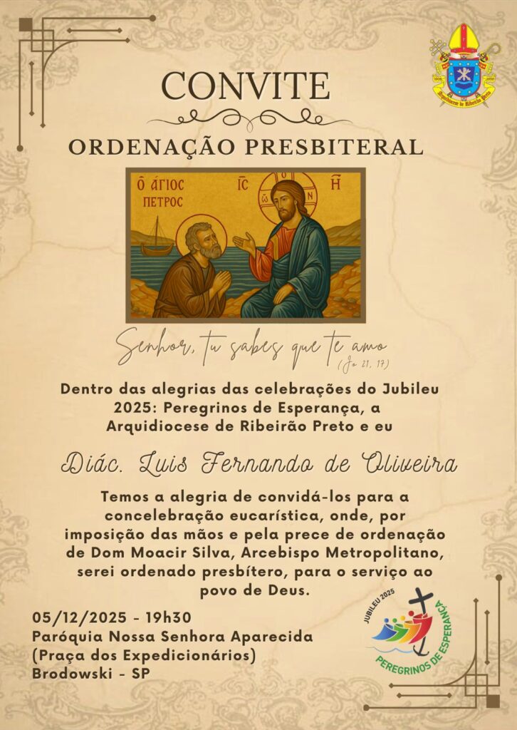 Aproxima-se a ordenação de mais três neopresbíteros para nossa Igreja particular de Ribeirão Preto neste ano de 2025. Pensando em favorecer a cultura vocacional, propomos duas preces para serem incluídas na Oração dos Fiéis nas Missas dos finais de semana que seguem as ordenações — uma para cada padre ordenado, seguida de uma prece pelas vocações — conforme as datas a seguir: