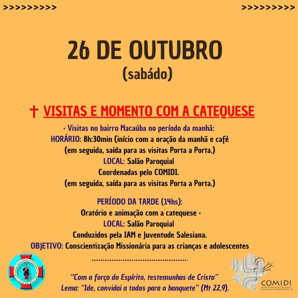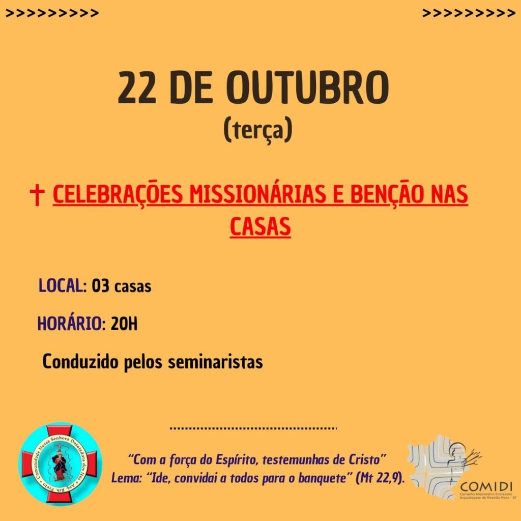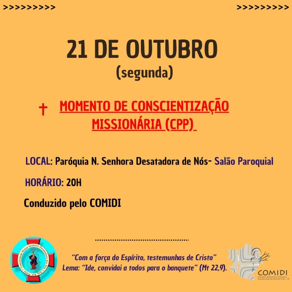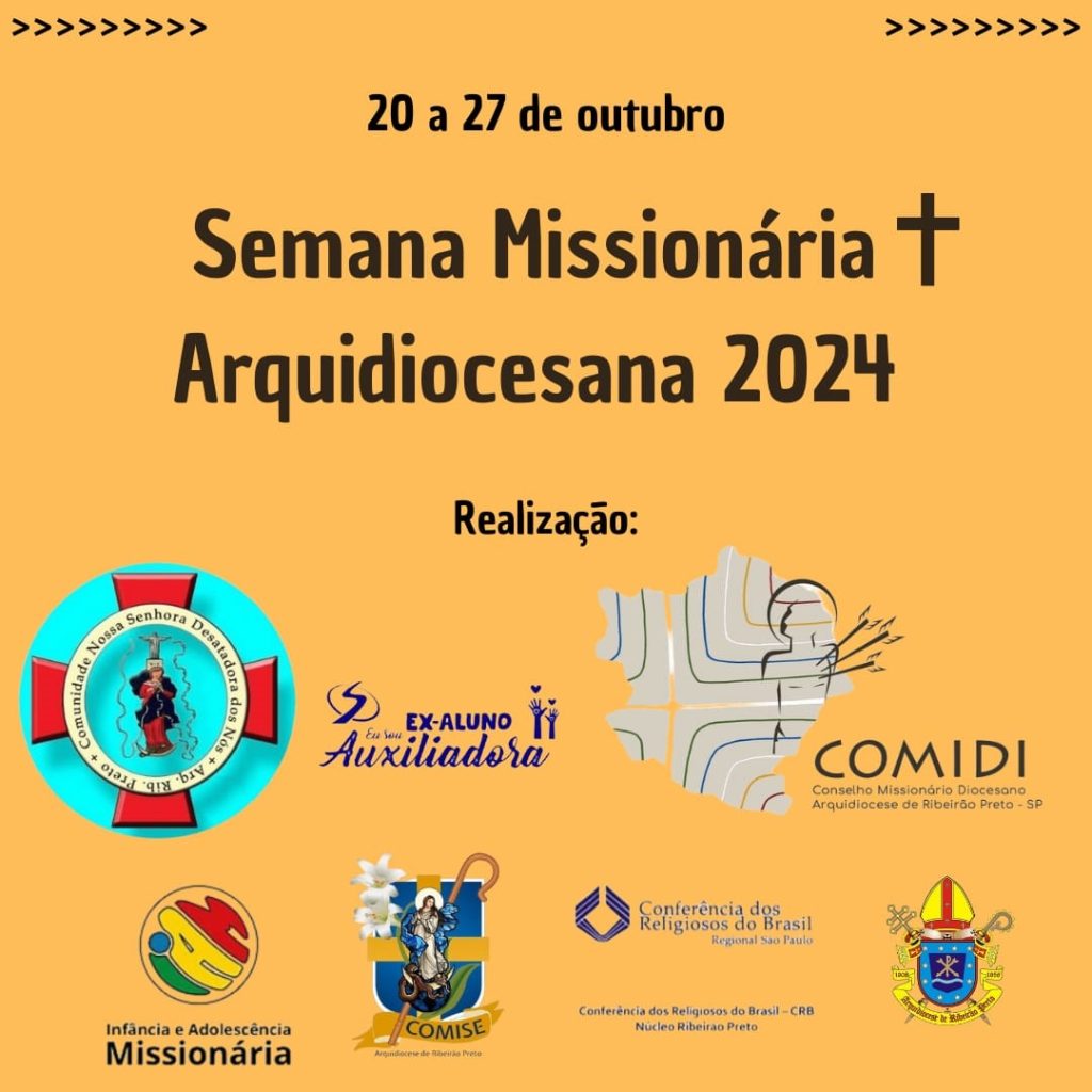 Com o tema: “Com a força do Espírito, testemunhas de Cristo” e o lema: “Ide, convidai a todos para o banquete”, somos inspirados a realizar a Semana Missionária Arquidiocesana, de 20 a 27 de outubro, e que tem como objetivo emergir a consciência missionária dos cristãos e não cristãos de nossa Igreja Particular de Ribeirão Preto.