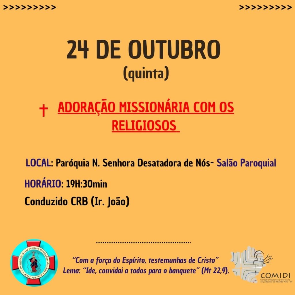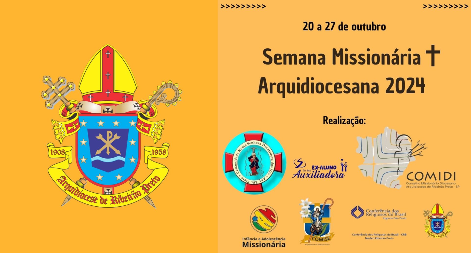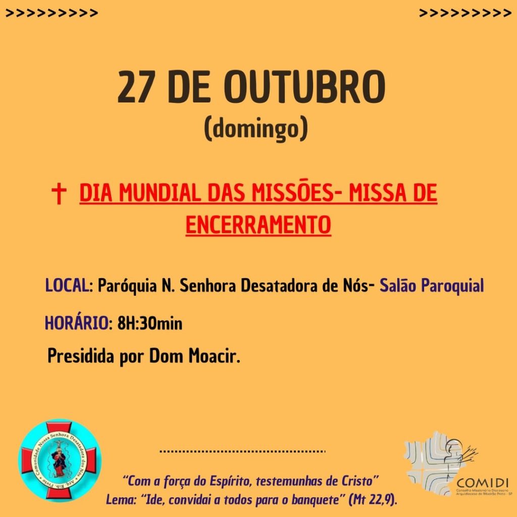 Com o tema: “Com a força do Espírito, testemunhas de Cristo” e o lema: “Ide, convidai a todos para o banquete”, somos inspirados a realizar a Semana Missionária Arquidiocesana, de 20 a 27 de outubro, e que tem como objetivo emergir a consciência missionária dos cristãos e não cristãos de nossa Igreja Particular de Ribeirão Preto.