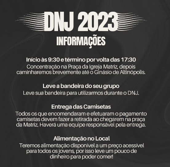 O Setor Juventude abriu as inscrições para o Dia Nacional da Juventude 2023. Com o tema: “E todos ficaram saciados” (Lucas 9, 17), a edição deste ano será no dia 29 de outubro, em Altinópolis.