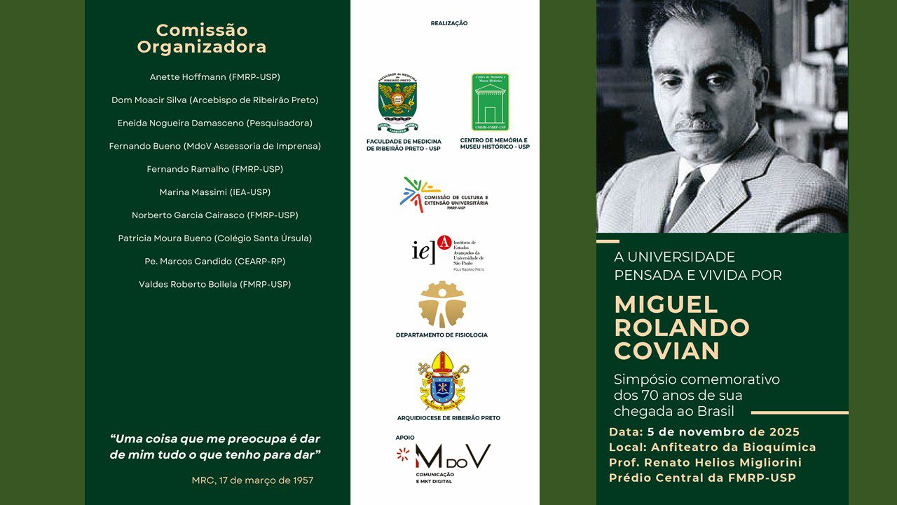 • 5 de novembro: Simpósio “A universidade pensada e vivida por Miguel Rolando Covian” – das 9 às 17 horas – Anfiteatro da Bioquímica “Prof. Renato Helios Migliorini – FMRP-USP.