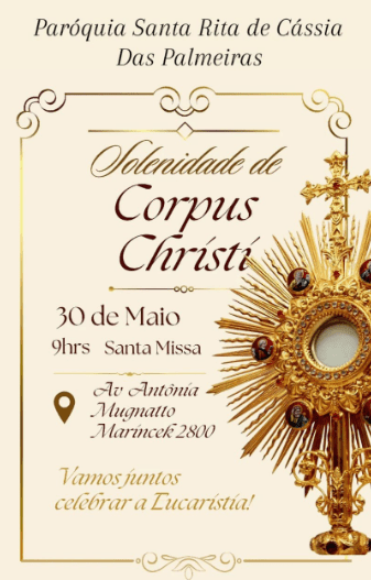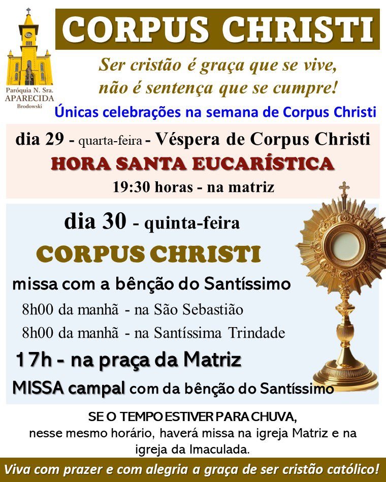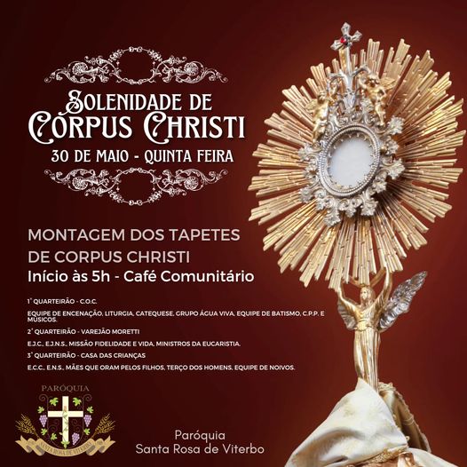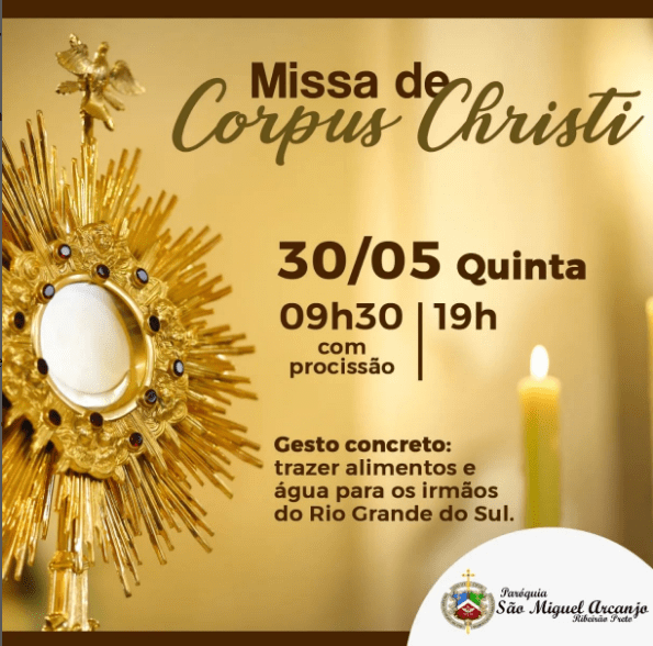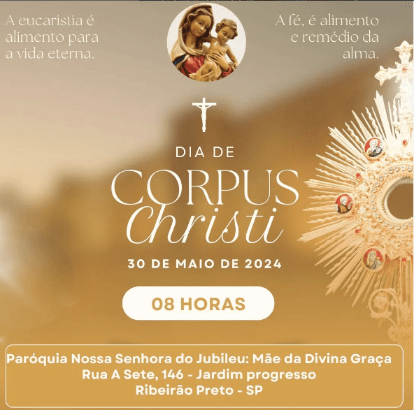 Confira a programação das celebrações de Corpus Christi nas paróquias da Arquidiocese de de Ribeirão Preto (organizada por foranias), na quinta-feira, 30 de maio de 2024.