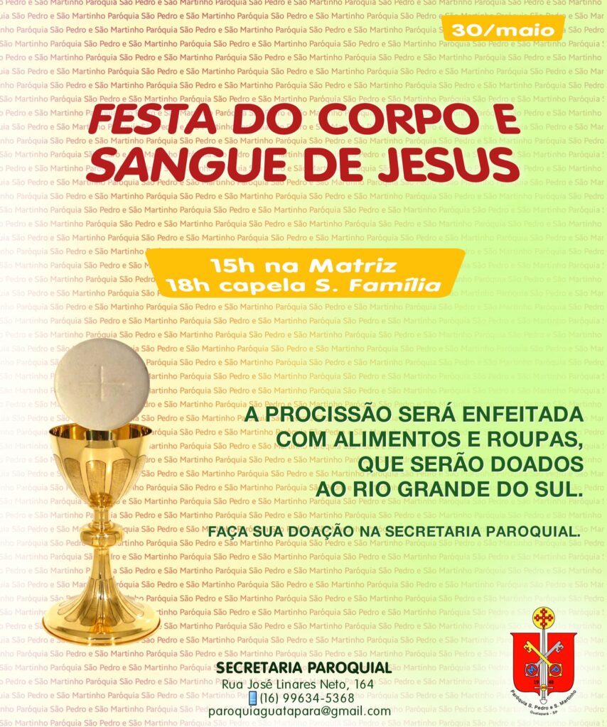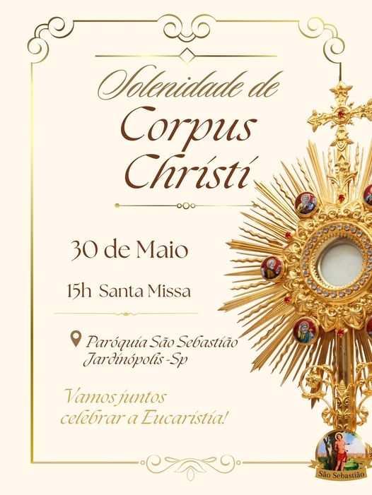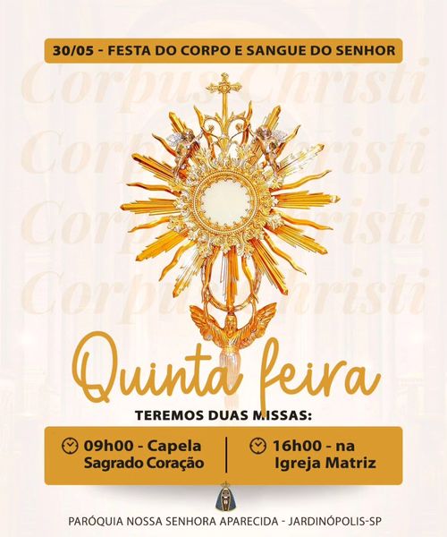15h: Missa celebrada pelas duas paróquias (Santa Rita de Cássia e São José Operário) no Santuário, com a participação especial de todos os M.E.S.C.; em seguida, sairemos em procissão com o Santíssimo Sacramento pelas ruas enfeitadas até a Capela Nossa Aparecida (Aparecidinha), onde será concedida a bênção de Jesus Eucaristia sobre o povo reunido